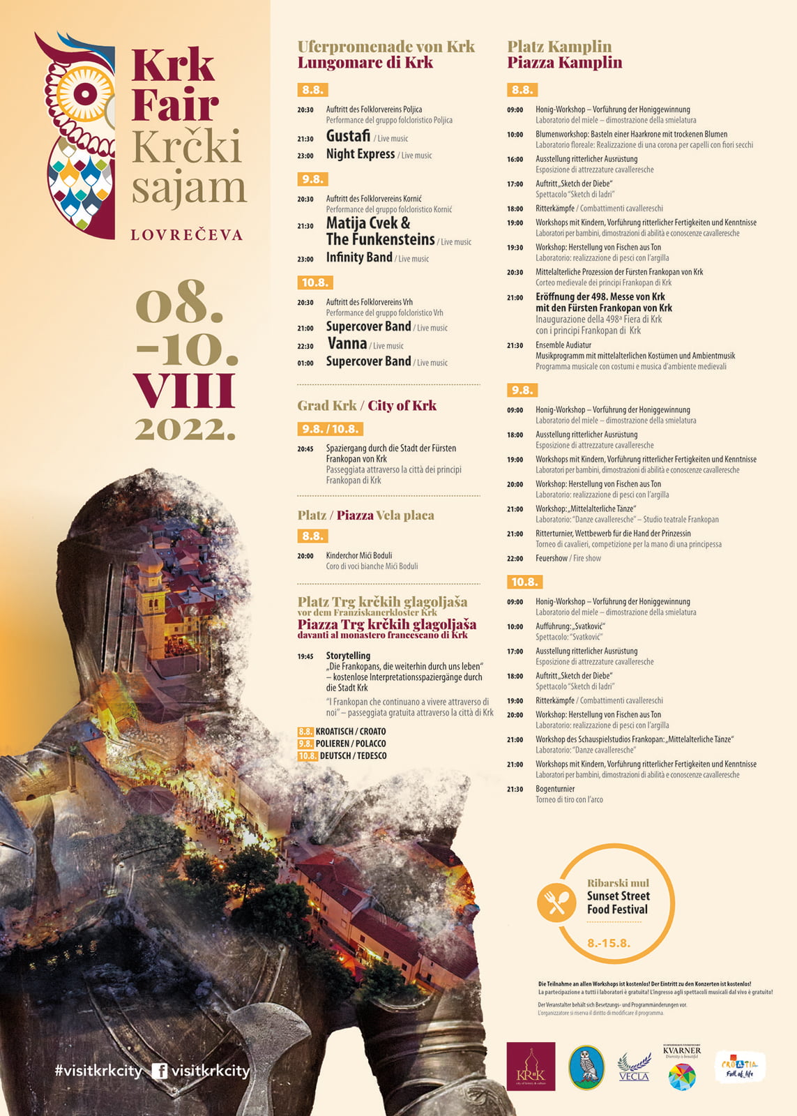 La piazza Kamplin si trasformerà per l’occasione in un vivace palcoscenico che offrirà ai visitatori la possibilità di vivere la città di Krk ai tempi dei principi Frankopan. A mettere in scena il revival della storia locale saranno i principi Frankopan in compagnia di numerosi ospiti, tra cui i membri dell’Associazione storica Kaštel, gli studenti dello Studio teatrale Frankopan e i membri del Club di tiro con l’arco Maura Kal. In piazza verranno esposte attrezzature medievali cavalleresche, si svolgeranno brevi sketch, combattimenti cavallereschi, laboratori per bambini, dimostrazioni di abilità e conoscenze cavalleresche. Secondo le attuali condizioni, l’inaugurazione della fiera sarà simbolica e priva di programma musicale.